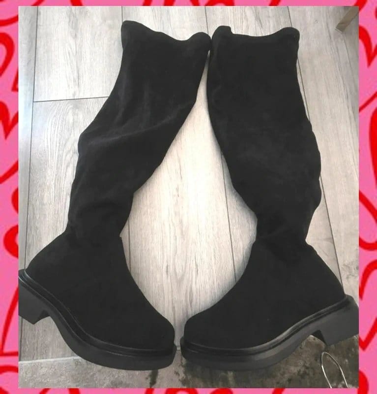 The ASOS Curve Black Flat Over Knee Boots Size 5 Wide Fit is made from suede.