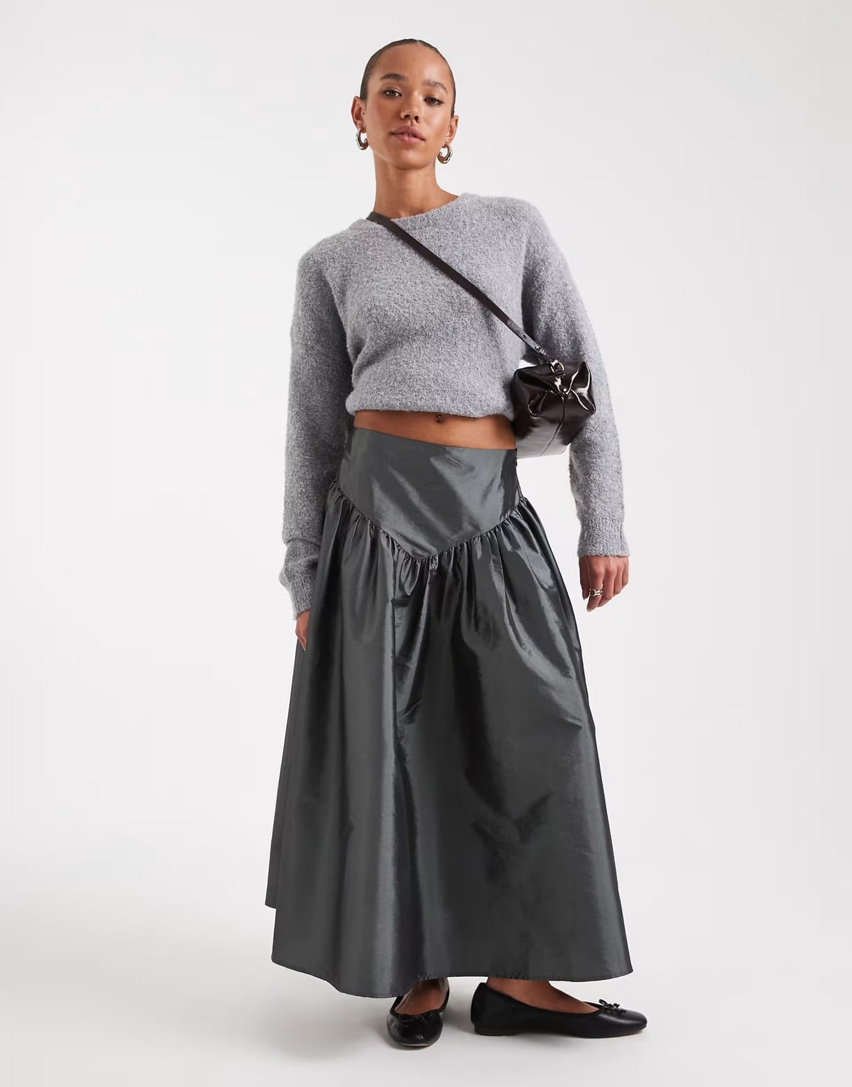 The ASOS Gunmetal Grey Taffeta Drop Waist Skirt is made from taffeta.