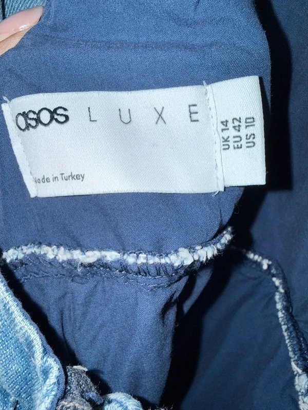 The ASOS Luxe denim dress features a classic mid-length cut and a distressed design for a trendy look. Made from 100% cotton, it offers a comfortable and stylish option.