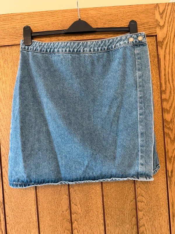 The ASOS Denim Wrap Skirt in Blue is available in sizes L.