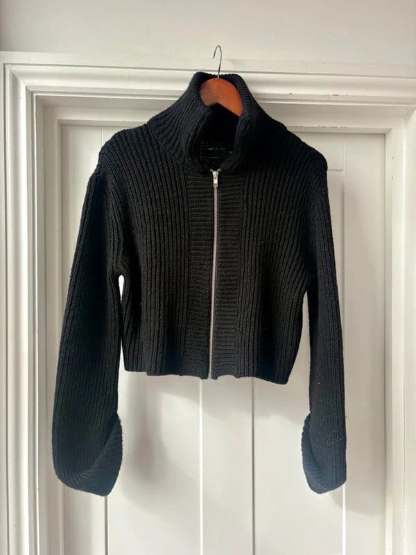 Stylish black ribbed knit zip-up jumper with a flattering cropped fit and high neck. Features a chunky silver zip and structured ribbed texture for an elevated look. Perfect for layering.