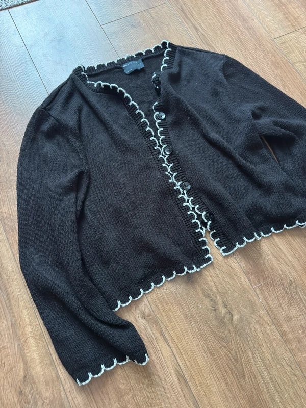 This black blanket stitch cardigan features embroidered scallop detailing. Perfect for adding a touch of elegance to any outfit, it's crafted from cozy material to keep you warm and stylish.