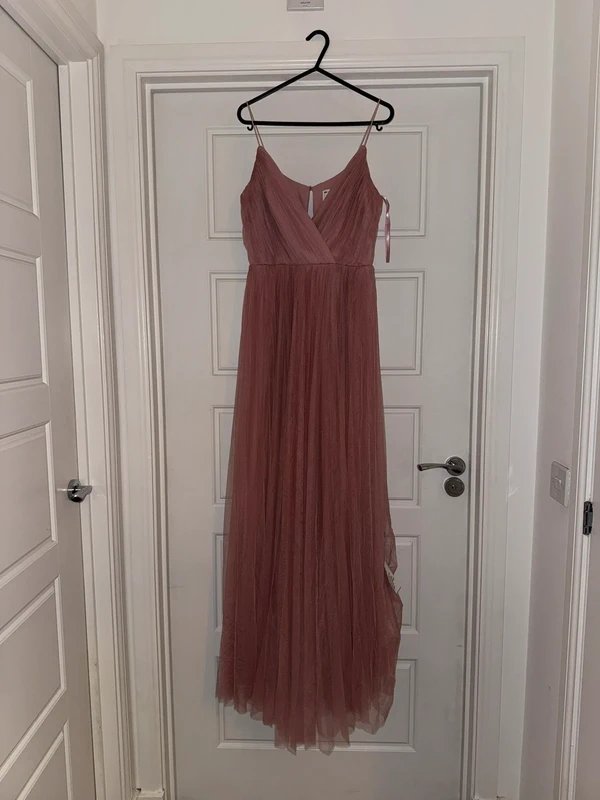 The ASOS Design Bridesmaid Cami Pleated Tulle Maxi Dress in Rose is available in sizes S.