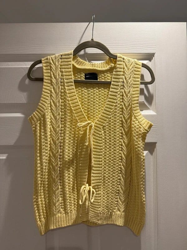 Bright buttermilk yellow cable knitted vest by ASOS Design. Features a tie front and a vest-style silhouette. Perfect for layering over casual outfits.