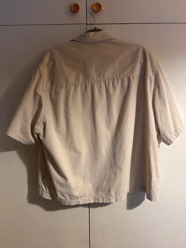 Casual beige corduroy short-sleeve shirt with a boxy fit and a button-down front. Perfect for a relaxed, everyday look.