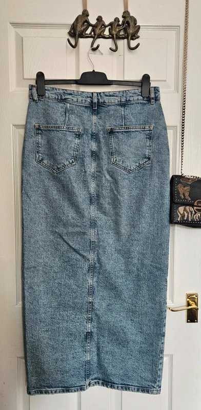 The ASOS Design Denim Midi Skirt in Light Blue is available in sizes M.
