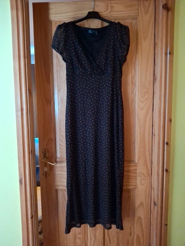 Black and red ditsy rose print mesh dress with a black polyester underskirt. Perfect for a romantic evening out or a casual day look.