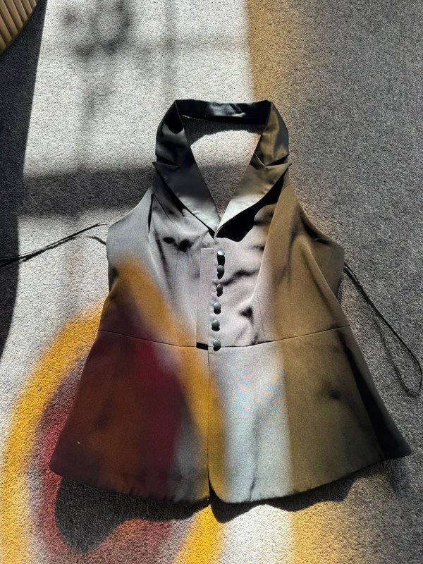 Featuring a halter neckline, this waistcoat is designed with button detailing and a boxy fit for a modern touch. Perfect for layering over casual outfits.