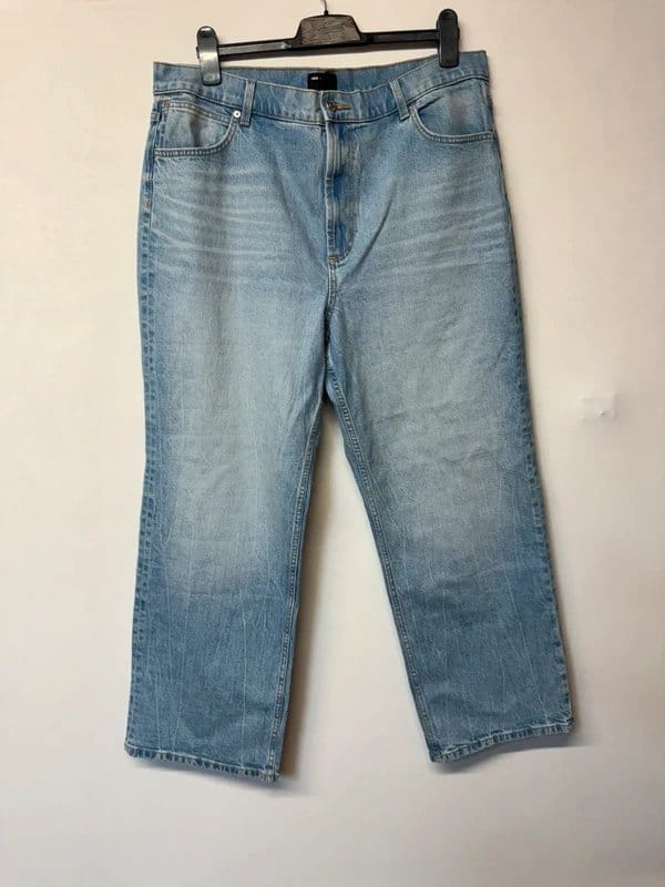 Stylish light blue denim jeans by ASOS Design. Featuring a classic straight-leg fit, distressed detailing, and a zip fly closure. Perfect for casual wear.