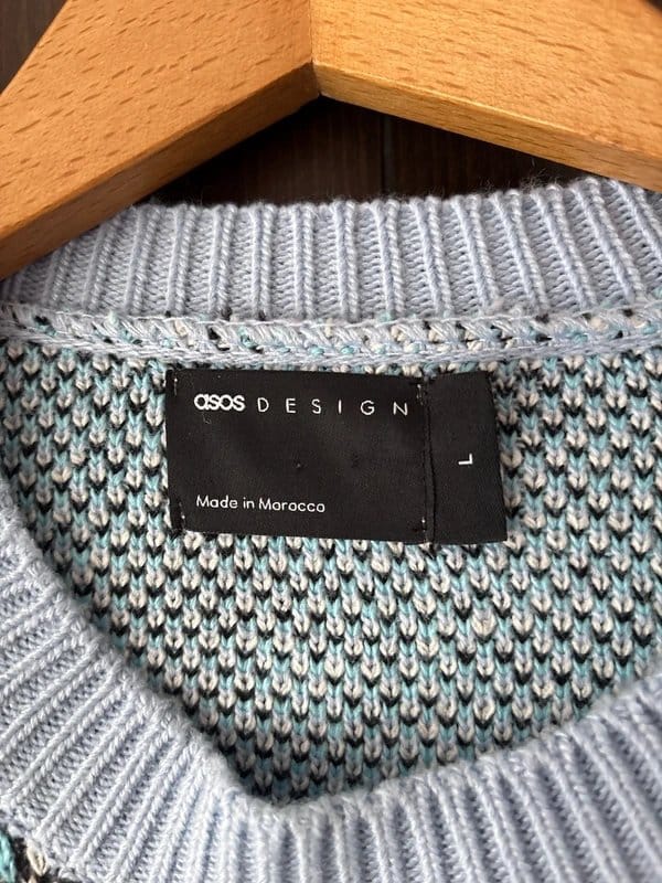 The ASOS Design Blue & Black Jacquard Knit Jumper is made from wool, polyester.