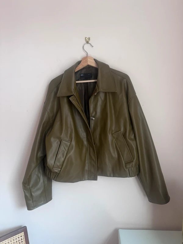 The ASOS Design Olive Green Leather Bomber Jacket is available in sizes L.