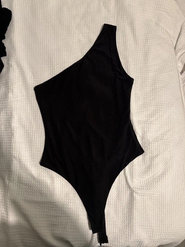 Sleek black one-shoulder bodysuit with a strapless design and a scoop neckline. Made from soft fabric for a comfortable fit. Ideal for casual outings or layering under jackets.