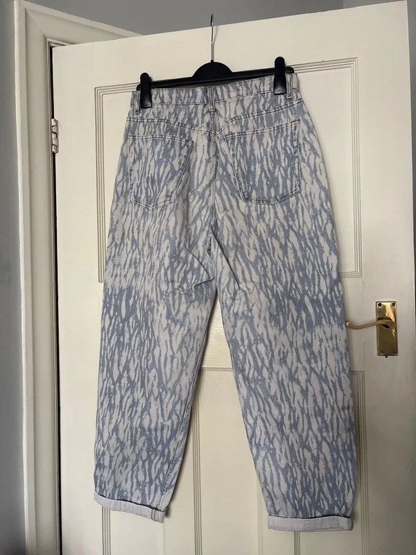 The ASOS Design Pattern Barrel Jeans in Light Blue/White is available in sizes M.