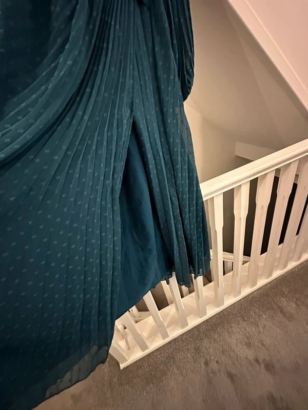 Elegant pine green maxi dress featuring pleated dobby chiffon fabric. Perfect for a formal or evening occasion.
