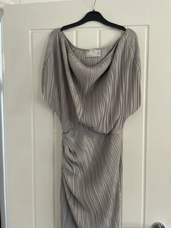 The ASOS Design Ruched Midi Dress with Drop Shoulders in Grey is available in sizes S.