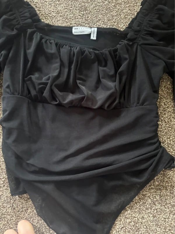 The ASOS Design Black Long-Sleeved Bodysuit with Ruched Mesh is available in sizes M.