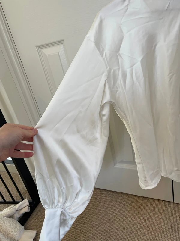 The ASOS Design Elegant High Neck Puff Sleeve Blouse in White is made from silk.