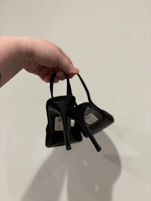Elegant black faux leather stiletto heels with a pointed toe and slingback ankle strap. Designed for a wide fit, these shoes feature a sleek minimal silhouette and are perfect for evening events or special occasions.