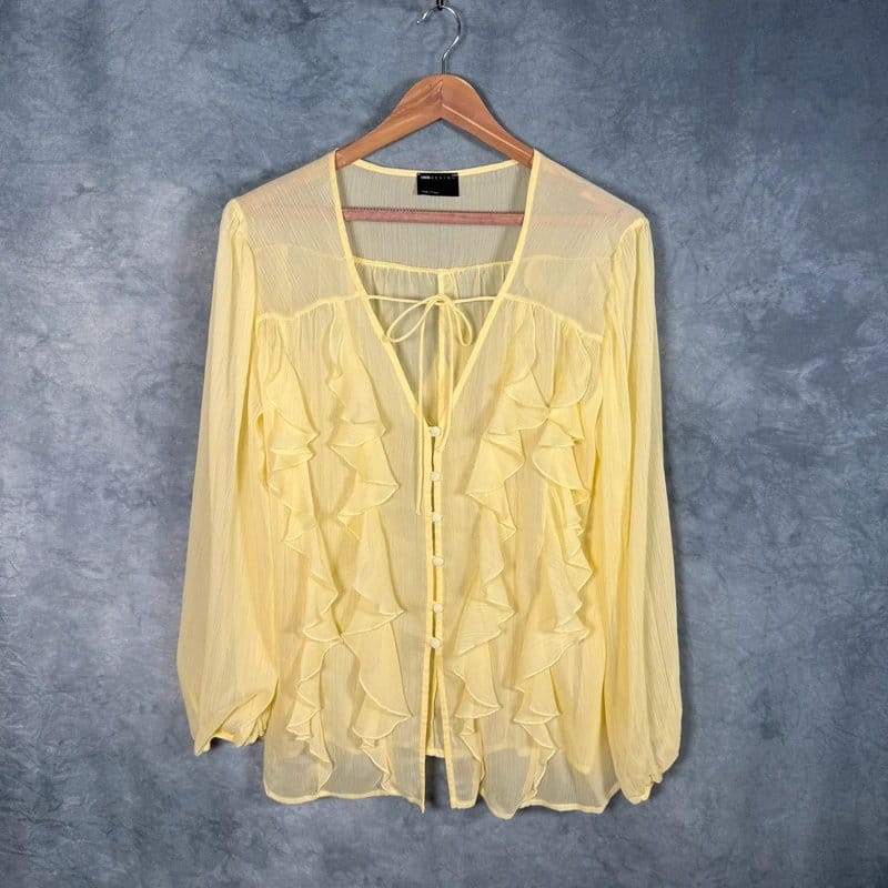 Delicate buttermilk yellow chiffon blouse with a ruffled neckline and sleeves. Features a semi-sheer fabric and a relaxed oversized fit. Ideal for casual and beach outings.