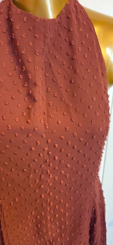 A brownish red halter dress with a flattering fit, perfect for a stylish look. The dress features a mesh back and a backless design for a touch of allure.