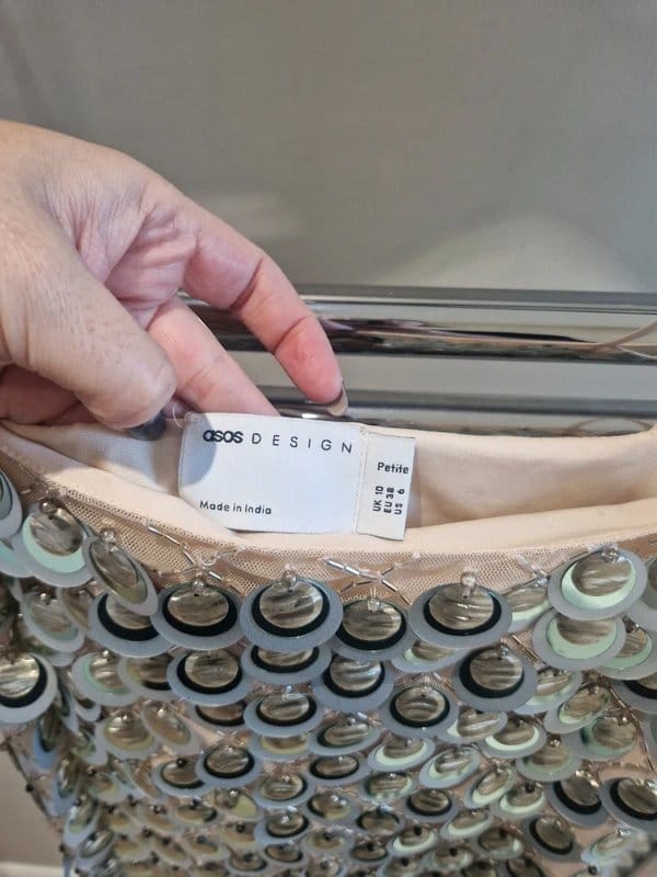 The ASOS Design Rose Sequin Disc Cami Slip Mini Dress is available in sizes S.