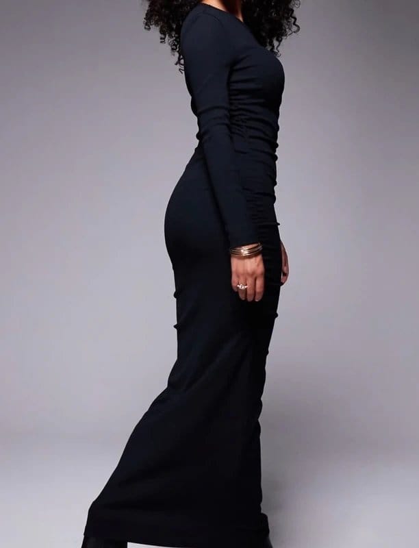 This black midi dress by ASOS Design features a ribbed ruched design for a flattering fit. The long sleeves and elegant silhouette make it perfect for evening events or date nights.