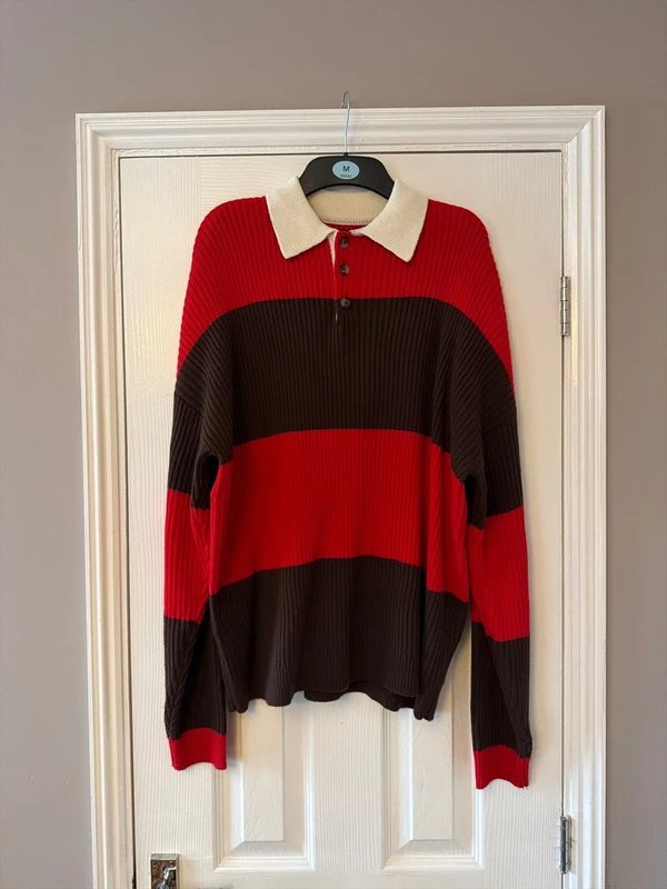The ASOS Red and Brown Stripe Knit Rugby Top is available in sizes M.