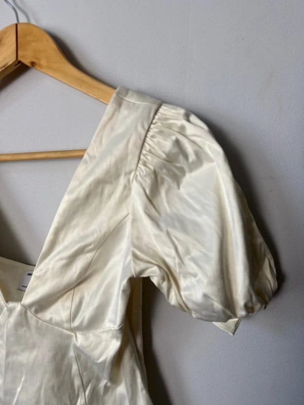 Elegant cream silky top by ASOS Design, featuring a corset-style bodice and puff sleeves. Perfect for a sophisticated look.