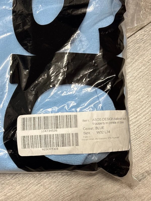 The ASOS Design Crinkle Blue Balloon Suit Trousers is available in sizes XL.