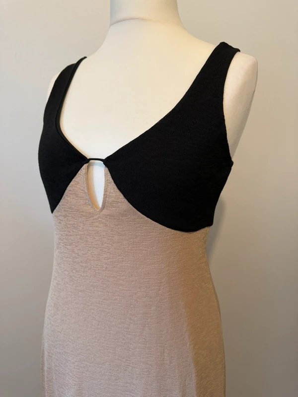Beige & Black Cut Out Maxi Dress — the must-have occasion dress for summer styling. Designed in beige and black, this sleeveless maxi dress features a flattering cut-out front and contrasting black bust detail. Crafted from soft stretch fabric, it offers a flattering silhouette for effortless summer styling. Includes a full-length jersey slip lining for comfort and coverage.