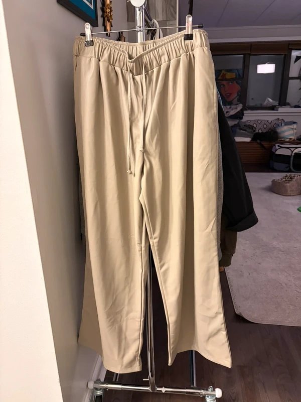 These beige faux leather trousers are the perfect mix of comfort and style. Designed with a flattering high-rise elastic waistband and adjustable drawstring, they give that effortless look. Soft, smooth faux leather feel, not stiff.