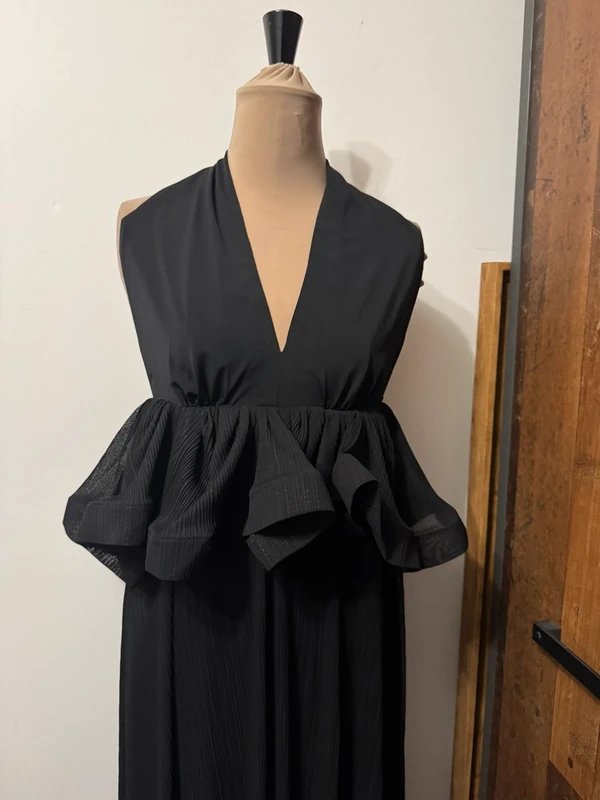 Elevate any evening with this stunning black halter-neck maxi dress. Featuring a dramatic V-neckline, this dress is perfect for evening events and formal occasions. Designed in rich black, it boasts a plisse fabric with a wired trim peplum for added flair. The maxi length and fitted silhouette ensure a flattering fit. Ideal for evening events, dinner parties, and special occasions.