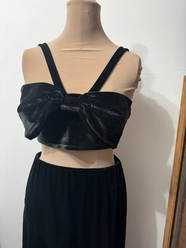 Black Velvet Crop Top with Bow — the must-have festive piece for going out. Designed in black velvet, this crop top features a large, statement bow detail at the bust and delicate spaghetti straps. Pair it with a matching high-waist, full-length black velvet skirt for a sophisticated and chic silhouette.