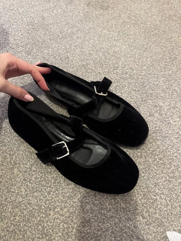 Classic black velvet Mary Jane shoes with a silver buckle detail. Perfect for adding a touch of elegance to any outfit.