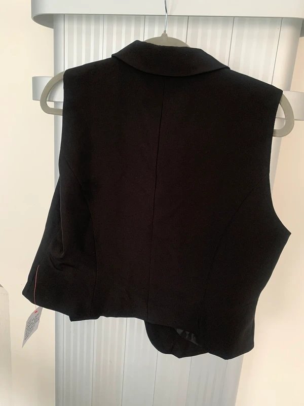 Elegant black waistcoat top for women, perfect for adding a touch of sophistication to any outfit. Crafted with a collared neckline and sleeveless design, this piece offers a sleek and polished look.