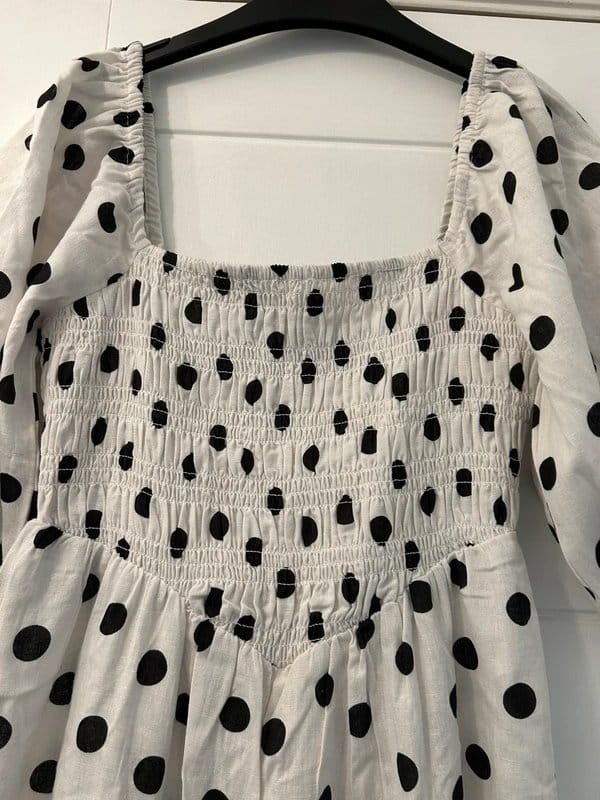 Playful polka dot jumpsuit in black and white featuring ruched front and elasticated shoulders and hem. Made from a blend of cotton, viscose, and linen, this piece is perfect for casual outings or summer events.