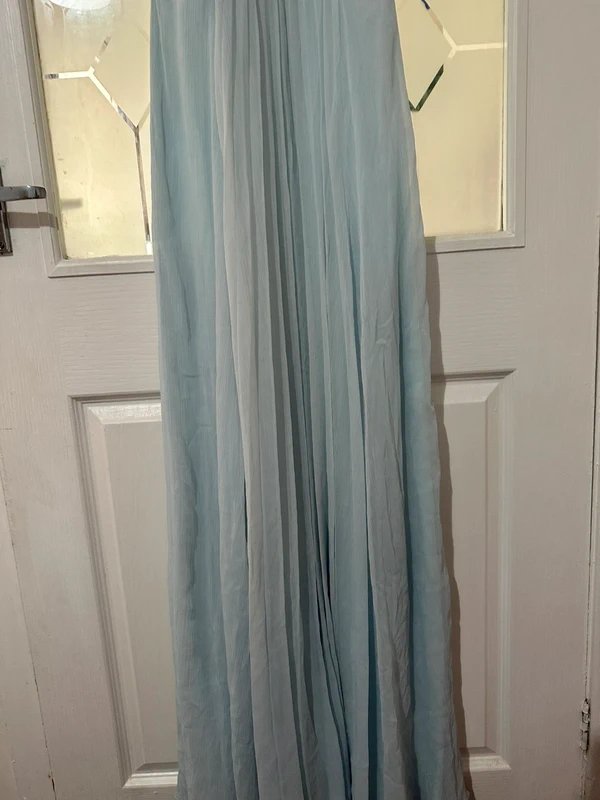 The ASOS Design Ruched Pinny Maxi Bridesmaid Dress in Light Blue is available in sizes S.