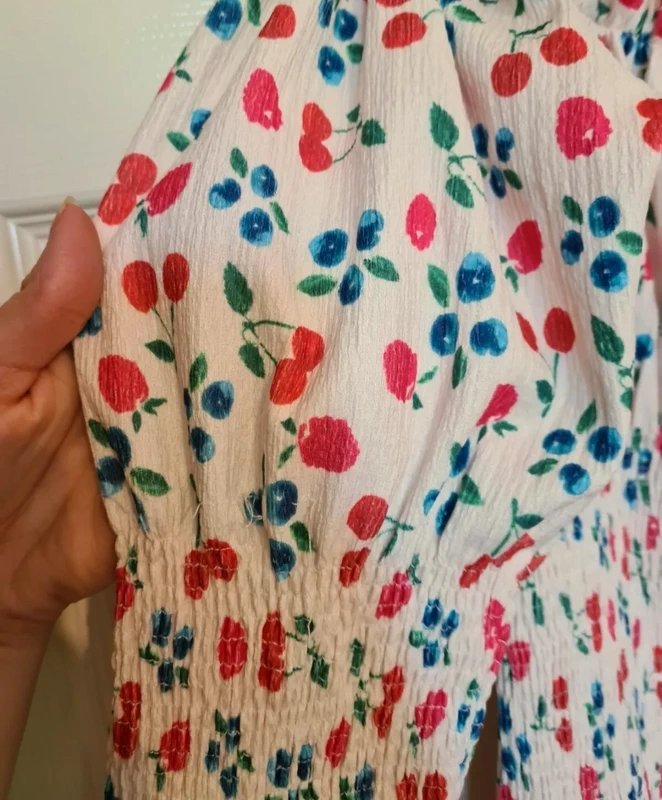 Brand new without tags, the ASOS Design Shirred Mini Dress features a slightly puffier chest and sleeves at the top. This ditsy fruit print piece is perfect for casual outings.