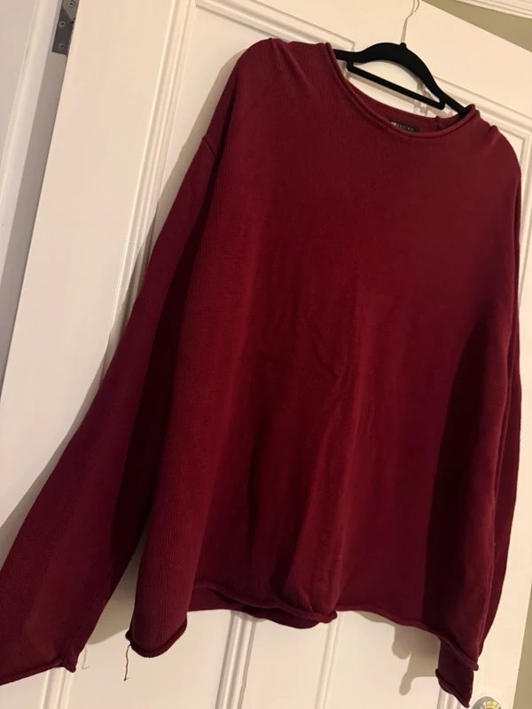 The ASOS Design Burgundy Lightweight Jumper is available in sizes M.