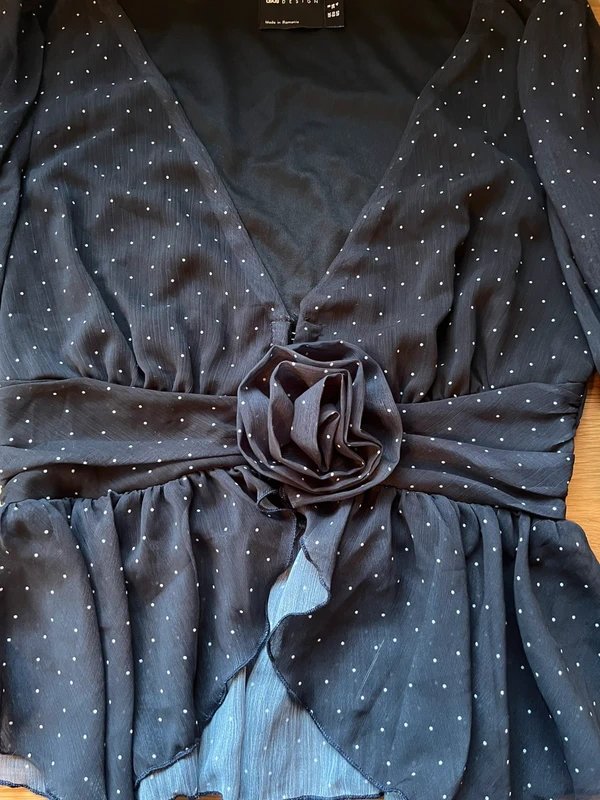Beautiful dark navy chiffon blouse with white polka dots. Features a rose flower clasp, hook and eye front, ruffled peplum, and puff sleeves with elastic at the ends. Lined for comfort.