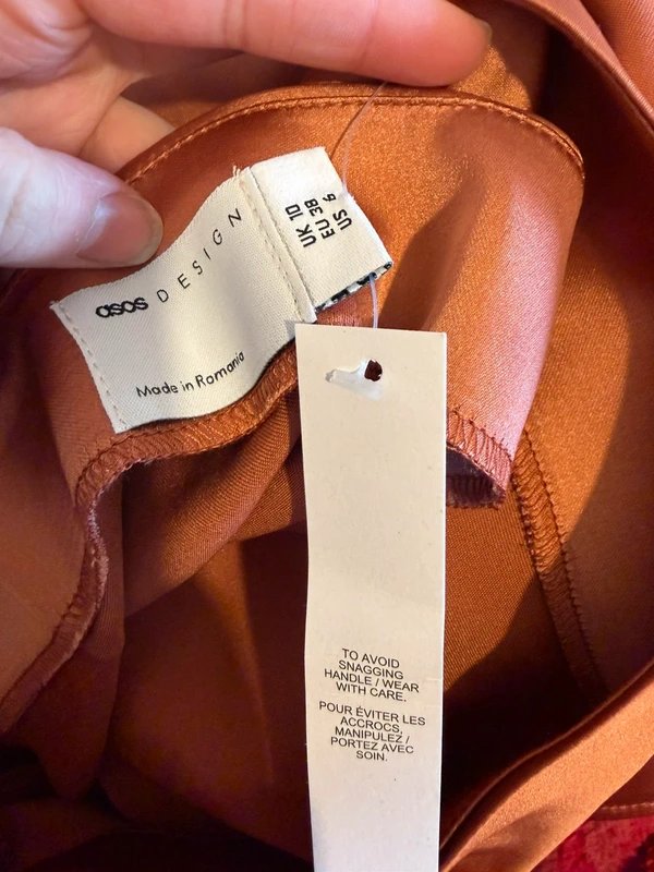 The ASOS Design Asymmetric Satin Maxi Skirt in Brown is made from satin.