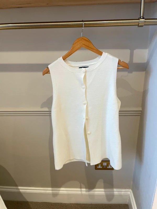 This cream knit waistcoat features a button-up front, short sleeves, and a relaxed fit. Perfect for layering over your casual outfits.
