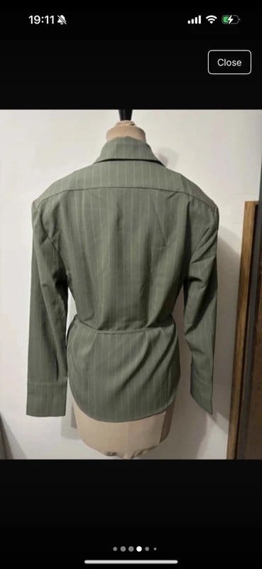 View Vinted's returns policyStylish khaki pinstripe button-up shirt with a tie-waist design and long sleeves. The olive green hue adds a modern touch, perfect for a casual yet chic office look.