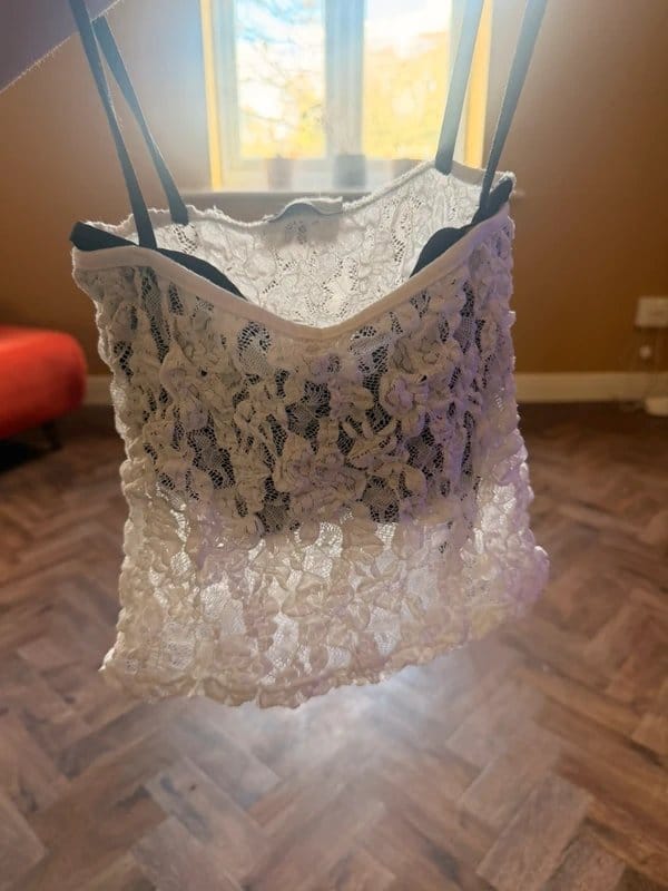 The ASOS Design White Lace Top with Black Bra Detail is available in sizes S.