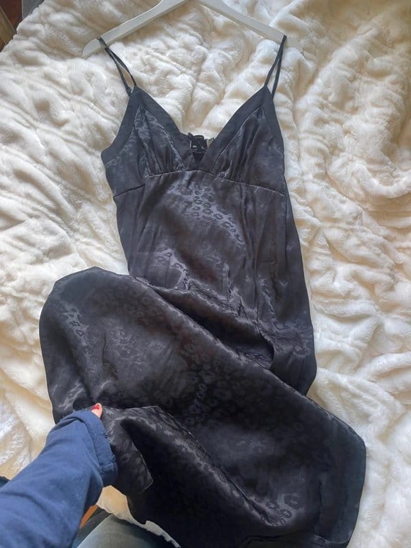 The ASOS Design Black Leopard Print Slip Dress is available in sizes M.