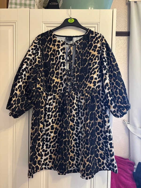 New without tags. This leopard print denim dress features a short sleeve and a casual fit, perfect for an edgy yet comfortable look.
