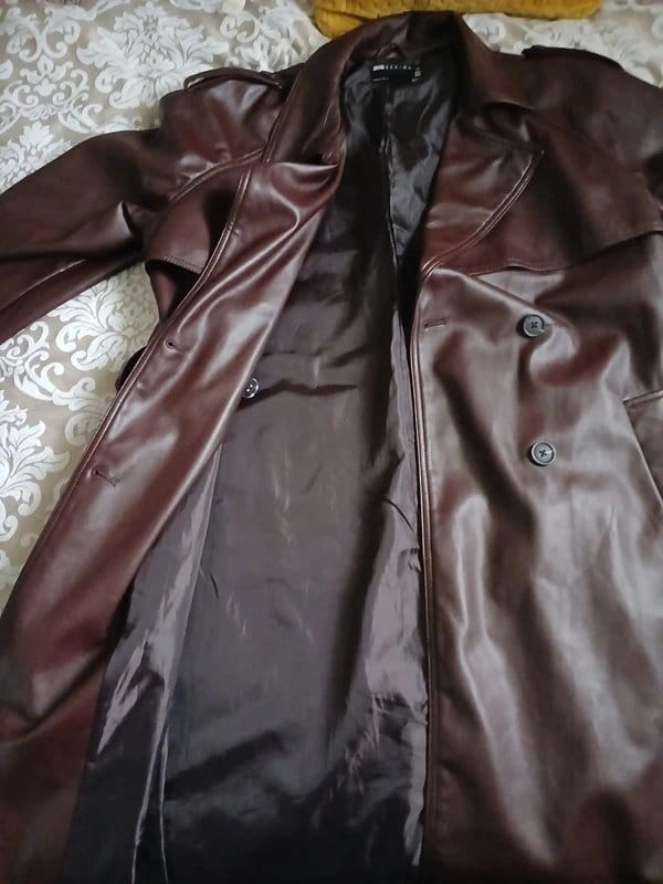 See all outfit ideasStylish burgundy trench coat with a leather look exterior. Features a double-breasted front, functional pockets, and a zip closure. Perfect for adding a touch of sophistication to any outfit.