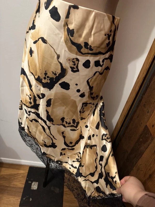 This midi skirt features a black and beige abstract print with a delicate black lace trim along the asymmetrical hemline. The fabric appears silky with a slight sheen, making it a chic and versatile piece that can be dressed up or down. Perfect for adding a touch of sophistication to any outfit.