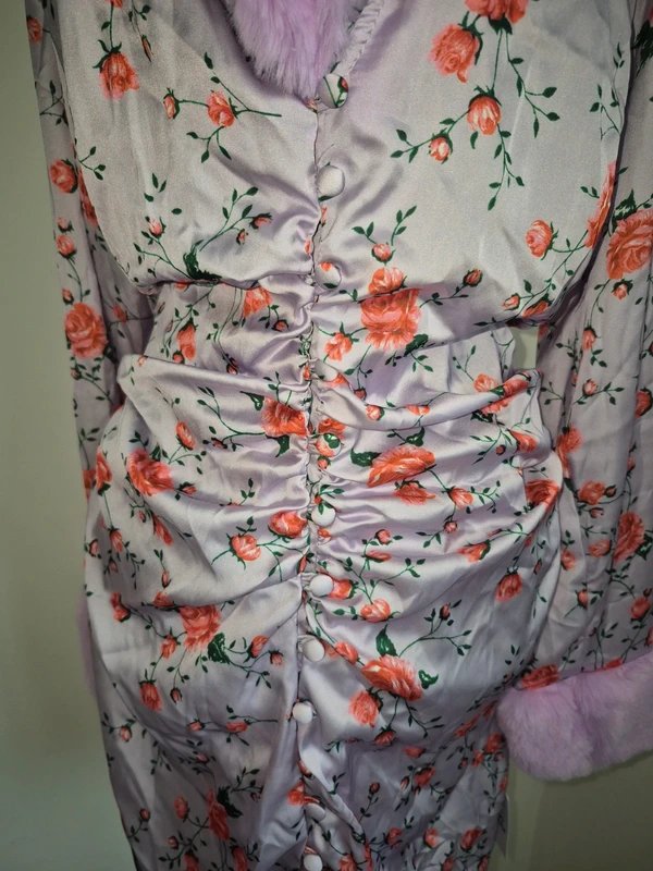 The lilac floral satin mini tea dress features a fur collar, creating a dreamy and elegant look. Perfect for special occasions or a night out.