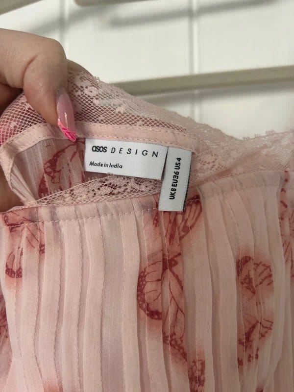 Charming pink chiffon dress with gorgeous lace details and a side zipper feature. Ideal for the summer months. Size 8 on ASOS Design.